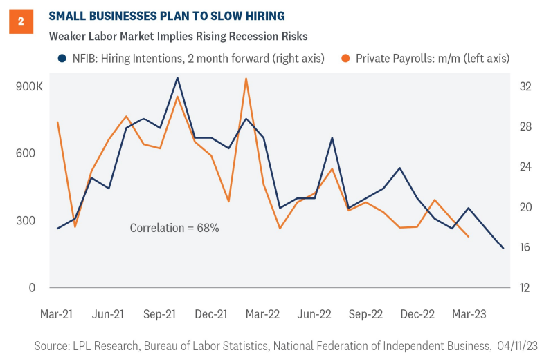 Businesses appeared to hunker down under the weight of tighter credit conditions and weaker economic growth. If small businesses are an accurate barometer, recession risks are rising and the labor market will likely cool in the coming months. Although the economy is slowing, the Fed continues its fight with inflation and will likely hike rates at the next meeting on May 2- 3. However, if the economy becomes more unstable, inflation continues to decelerate, and the job market loosens, the Fed could pivot to rate cuts by the end of the year.