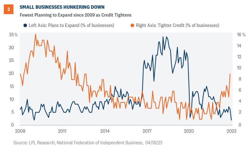 We know small businesses are especially concerned about a potential credit crunch. As shown in Figure 3, firms are hunkering down as few have expansionary plans in the near future. In fact, the number of firms reporting any expansion plans is the lowest since early 2009 when the economy was in the depths of the Great Financial Crisis. No doubt, tighter credit conditions impacted those decisions. The percent of small businesses reporting tighter credit is the highest since 2012, as lending institutions tighten up under the uncertainty of the macro landscape and following mid-March banking turmoil.