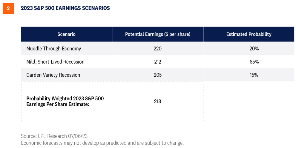 For now, given heightened economic uncertainty, we use a weighted probability approach to forecast earnings for this year. Based on estimated probabilities of these scenarios, as shown in Figure 2, we arrive at our 2023 S&P 500 earnings per share forecast of $213, slightly below 2022 levels. Though the market’s expectations for earnings have improved of late, we still see sufficient pessimism to support modestly higher stock prices if actual results come in near our bull case “soft landing” scenario. But the bar has been raised.