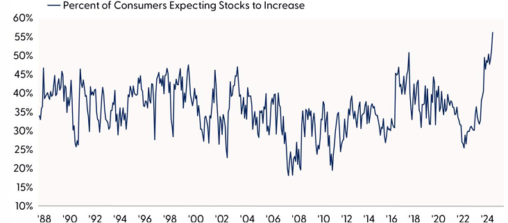Our expectation for a near-term pullback is also supported by some measures of sentiment that suggest the amount of investor optimism has gotten stretched following such a strong rally in stocks this year. One particular investor survey illustrates this point. Each month, the Conference Board issues a consumer confidence survey, a sample from approximately 3,000 households across the United States. The survey asks respondents about their optimism (or pessimism) about the stock market, among other things. In the most recent November release, the percent of consumers who expected the stock market to increase hit an all-time high at over 56%. The survey goes back to the late-1980s, so this is meaningful.