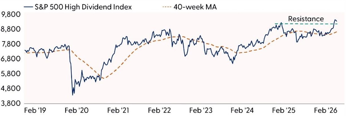 S&P 500 U.S. Dividend Growers Index (dividend growth): The index has climbed steadily above a consistent uptrend that has been in place since April 2025. Realized volatility has been exceptionally low, with the index registering a maximum drawdown over this period of only around 3%. Momentum indicators remain bullish, but not overbought, and point to further upside potential. On a relative basis, the S&P 500 U.S. Dividend Growers Index has broken out of a bottom versus the S&P 500, pointing to further runway for outperformance.