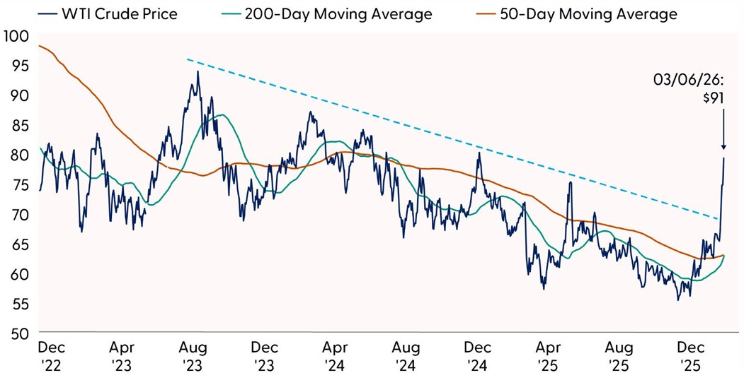 It’s difficult to separate the human and emotional side of war from the economic and market impacts. Without minimizing the human element, we focus on markets here. From that perspective, the energy market is the primary way through which this crisis will affect markets globally. Oil and natural gas production and transit have already been disrupted, sending prices sharply higher. If these disruptions are severe and long lasting, they have the potential to influence inflation expectations, weigh on business confidence, and elevate volatility across asset classes, all of which will likely translate into lower stock prices. Simply put, the more intense and prolonged the geopolitical shock, the larger the likely market impact.