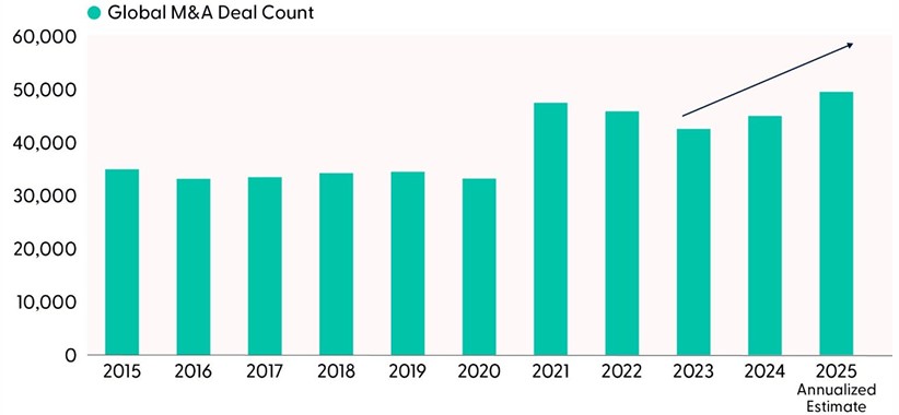 Merger and acquisition (M&A) activity is gaining traction after a muted period, driven by deregulation, Fed rate cuts, and surging demand for AI-related transactions. With deal volume trending higher, as illustrated in the “M&A Activity is Gaining Momentum” chart, it creates attractive opportunities for merger arbitrage strategies and private equity investors in the alternative investments arena. The backdrop suggests improving conditions for dealmakers, which could broaden the investible universe and support returns in 2026.