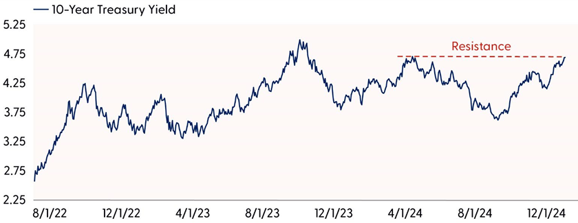 Stocks are struggling to gain traction in the new year. Recent signs of inflation pressure and reduced expectations for Fed rate cuts have pushed rates to uncomfortably high levels, complicating the macro backdrop. Unfortunately for stocks, near-term technical trends point to additional upside risk for Treasury yields. Based on this backdrop and the current technical setup for the broader market, we believe a deeper pullback remains potentially on the table as market breadth and momentum wane. However, despite the near-term risks, we believe investors should give the bull market the benefit of the doubt as the longer-term uptrend is intact, leadership remains cyclical, and fundamentals are on solid footing.