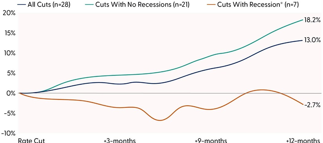 This rate-cutting cycle is unique because stocks are near all-time highs. In previous instances when the Fed cut rates and stocks were at or near record highs (we found 28 cases), the S&P 500 was 13% higher on average 12 months later, with 93% of those 28 periods producing gains. Filtering that further, when the U.S. economy was not in recession around a rate cut, the average 12-month return for the S&P 500 increased to 18%, with gains in all 21 periods. Near recessions, the S&P 500 lost 2.7% on average in the 12 months after the Fed reduced rates, with only 25% of periods generating a gain.