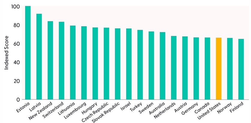 As this “new regime” takes shape, the U.S. has the opportunity to take advantage of change. In today’s globalized economy, the structure of a country’s tax system plays a crucial role in determining its economic performance. International tax competitiveness, which refers to how favorable a country’s tax policies are compared to others, can significantly impact both business and investment decisions. In times of economic slowdown, the policy response — which often includes monetary easing — should include business-friendly tax policies. Here’s why investors should carefully monitor for any progress on the tax front that lifts the U.S. from its 18th rank in tax competitiveness — currently behind other developed countries like Germany and Canada.