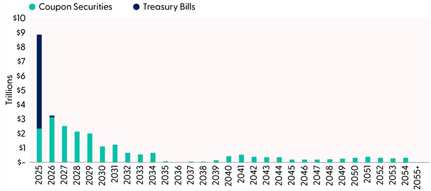 The U.S. Treasury market is entering a significant transition period in 2025, facing both structural adjustments and all-too-familiar policy discussions. As the Federal Reserve’s (Fed) shift from a zero interest-rate policy (ZIRP) coincides with a substantial $7.5 trillion refinancing cycle, markets are also preparing for another round of debt ceiling negotiations. For investors, this environment presents compelling opportunities in Treasury securities: Yields above 4% across much of the Treasury curve offer attractive risk-free returns (although market volatility is expected to remain elevated), with potential for capital appreciation if yields fall. However, careful security selection is warranted — investors might consider avoiding Treasury Bills (T-bills) maturing around potential debt ceiling deadlines while taking advantage of higher yields in longer-dated securities that extend beyond these near-term political discussions (we think the sweet spot is in the 1–5-year parts of the Treasury curve). While each of these challenges is manageable, their combination requires thoughtful navigation from policymakers and careful consideration from market participants.