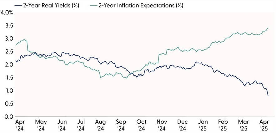 While equity markets have borne the brunt of tariff and subsequent trade war concerns, fixed income markets are dealing with the competing narrative of slowing growth and higher inflation. High inflation, of course, erodes the value of the fixed nature of bond coupon payments, whereas slowing growth tends to increase the value of high quality fixed income as it’s traditionally benefited from the flight-to-safety haven trade. However, since the beginning of the new Trump administration, short-term inflation expectations have increased, while at the same time growth expectations have been falling (growth expectations can be derived from the fall in “real yields”, which are Treasury securities that are adjusted for inflation expectations). Traditionally, when real yields decline while inflation expectations rise, fixed income markets are suggesting that economic growth is expected to weaken while consumer and business prices are expected to increase — the defining characteristics of stagflation, which is not a good environment for fixed income markets.
